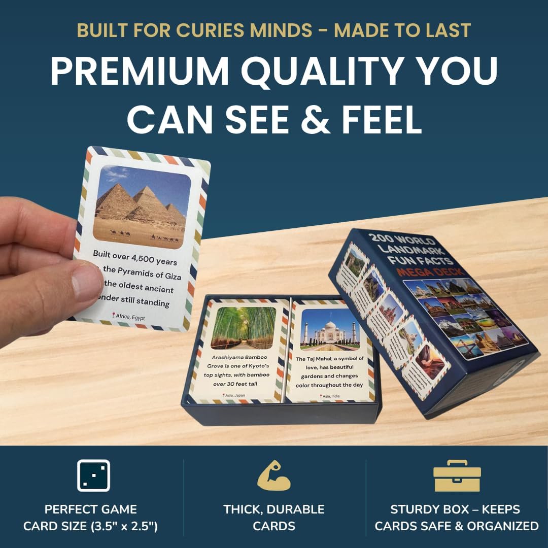 This deck began as a simple learning activity for my son, who was fascinated by famous places around the world. What started as a handful of notes about landmarks quickly grew into a full set of 200 World Landmark Fun Fact Cards.